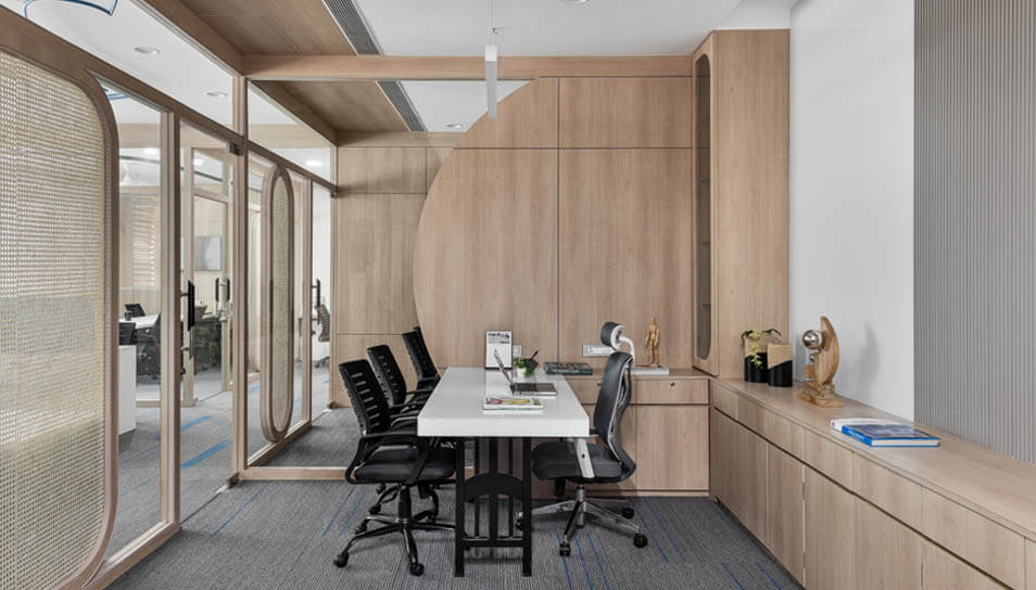 The office layout is carefully planned to ensure smooth workflow and clear zoning. Open workstations promote collaboration and team interaction, while cabins and meeting rooms provide privacy and focus.