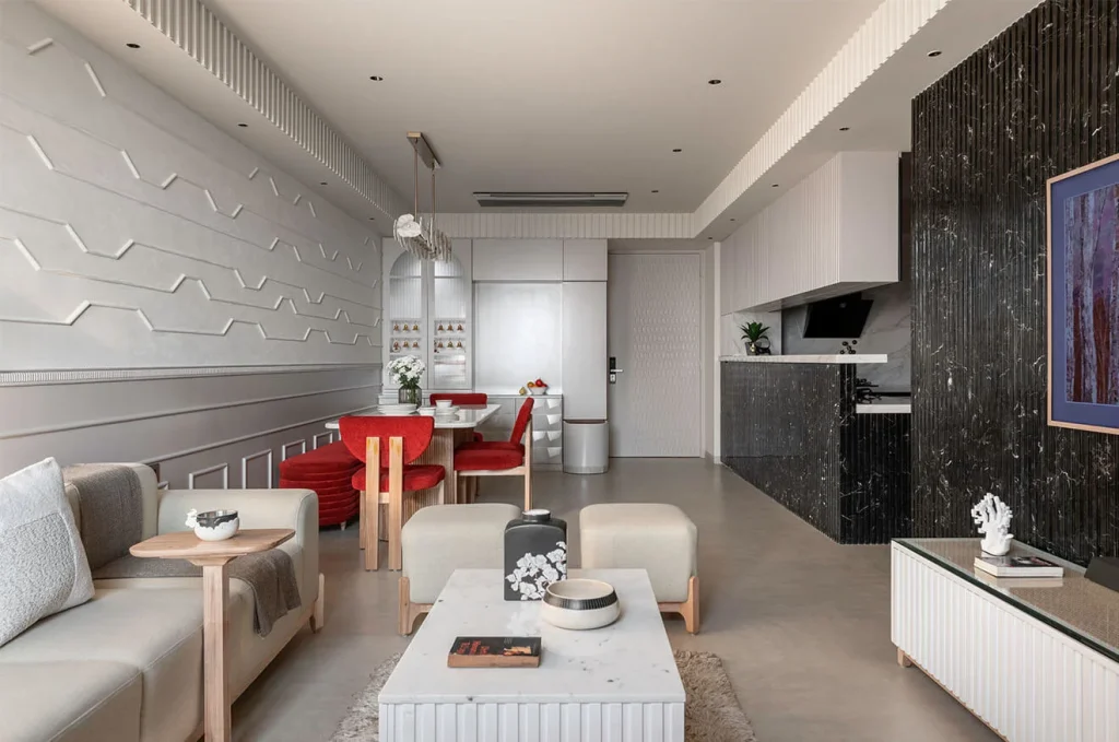 The living area is anchored by a fluted marble TV wall, creating a strong yet elegant focal point. Bold red dining chairs introduce contrast and vibrancy within the otherwise subtle palette. An open kitchen layout enhances spatial flow and natural light, while cashmere-toned cabinetry adds warmth and softness to the space.