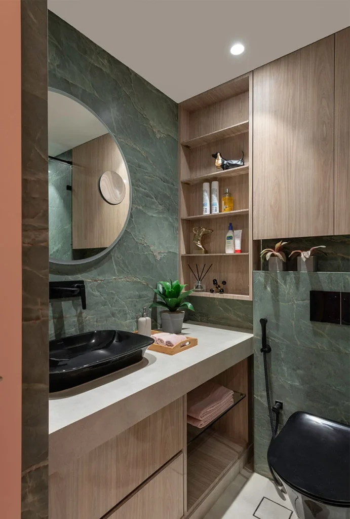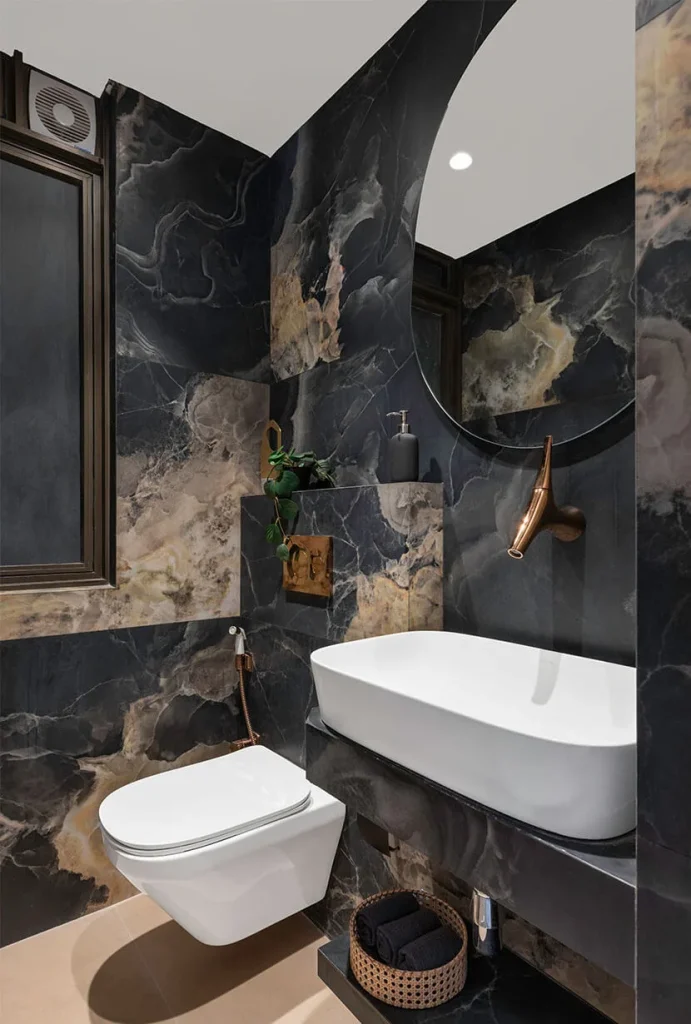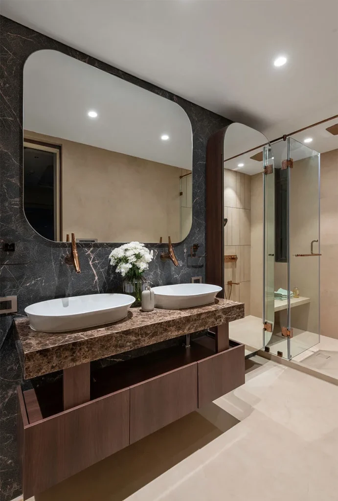 Natural marble, textured finishes and subtle metallic highlights are used selectively to enhance sophistication without overwhelming the space. Custom furniture and detailing ensure consistency across the residence.